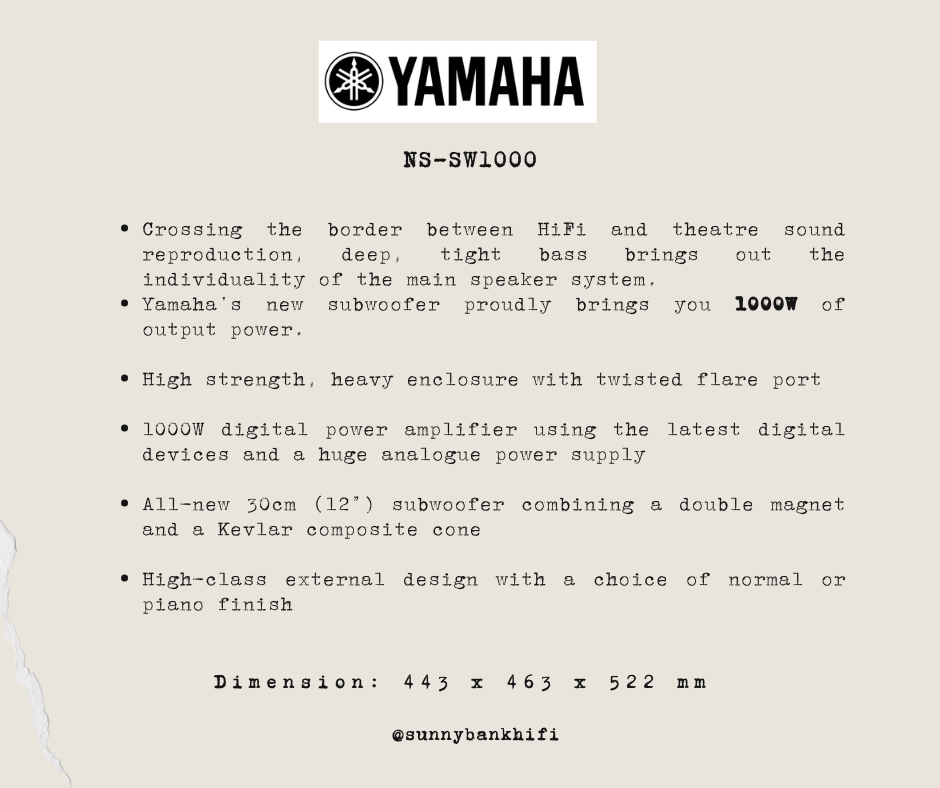 Crossing the border between HiFi and theatre sound reproduction, deep, tight bass brings out the individuality of the main speaker system. Yamaha’s new subwoofer proudly brings you 1000W of output power.
