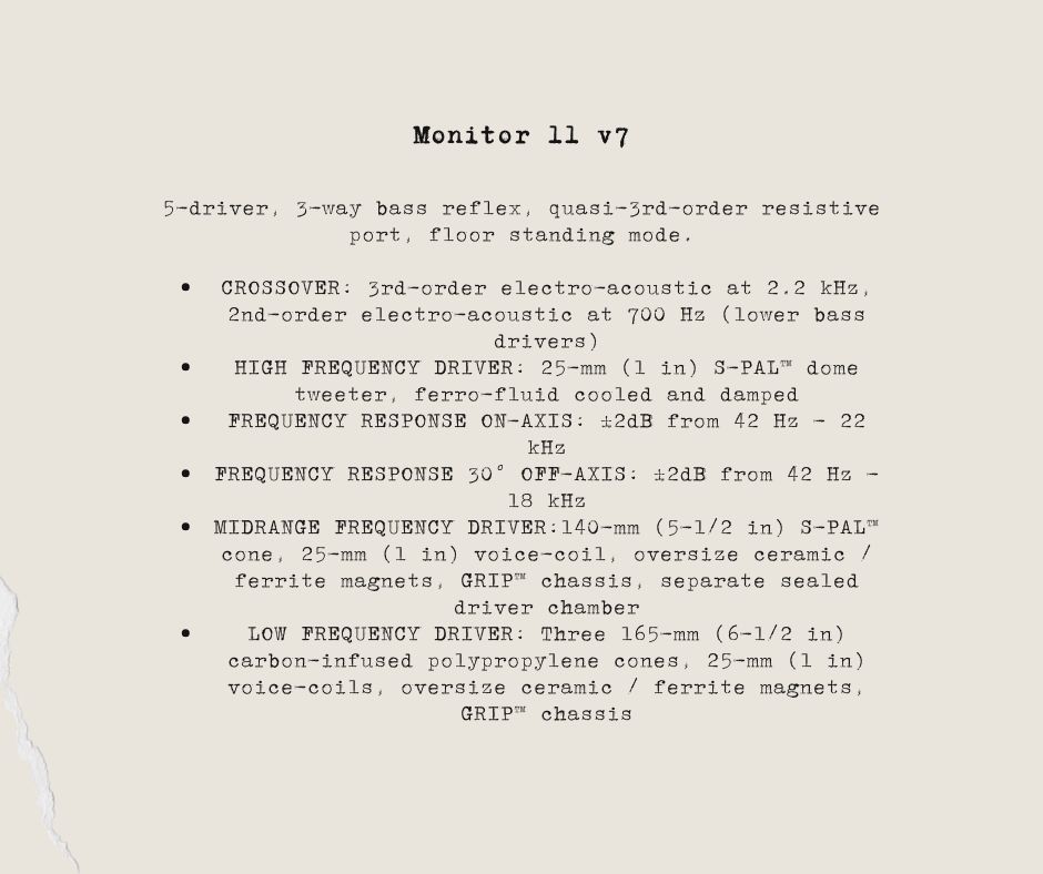 | LOW FREQUENCY DRIVER | Three 165-mm (6-1/2 in) carbon-infused polypropylene cones, 25-mm (1 in) voice-coils, oversize ceramic / ferrite magnets, GRIP™ chassis |